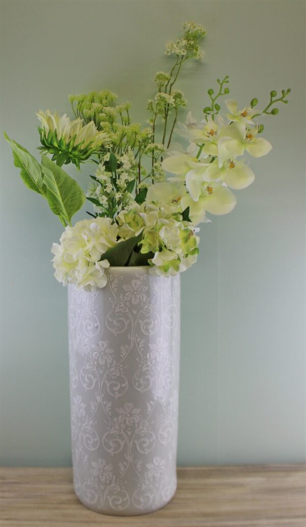 A single spray of faux hydrangea with cream flowers. The spray is made of polyester leaves and flowers and a plastic stem. The leaves contain wire which can be manipulated to position the leaves as required. Measurements: 16 x 49 x 16cm SKU: FL1018