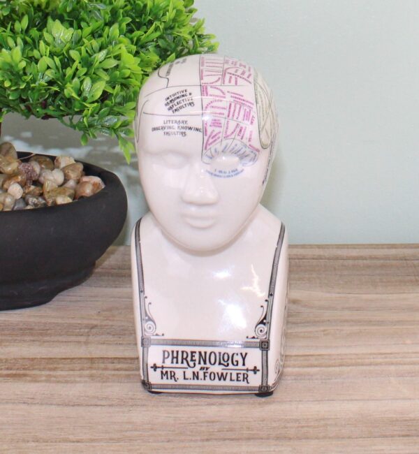 Phrenology is from Ancient Greek meaning ‘knowledge’. It is a pseudoscience which involves measuring bumps on the skull to predict mental traits. This ceramic phrenology head stands 15cm tall and features a quote from Mr L N Fowler, the founder of the art along with the sections of the head and their characteristics. Made of porcelain and featuring protective pads on the bottom to protect your furniture. Measurements: 7 x 15 x 7cm SKU: TJN0306