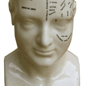 Phrenology is from Ancient Greek meaning ‘knowledge’. It is a pseudoscience which involves measuring bumps on the skull to predict mental traits. This ceramic phrenology head stands 19cm tall and features a quote from Mr L N Fowler, the founder of the art along with the sections of the head and their characteristics. Made of ceramic, off white in colour with a crackled finish and black lettering. Measurements: 11 x 19 x 9cm