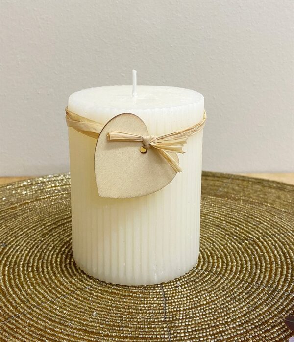 A stylish cream pillar candle with ridge effect, embellished with a wooden heart suspended on a raffia string. A simple decoration perfect for creating a warm and inviting atmosphere. Measurements: D6.7 x H9 x W6.7cm