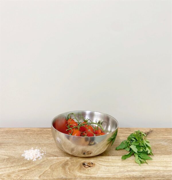 A small stainless steel bowl which is double walled insulated and unbreakable. This versatile item is lightweight and easy to hold while its flat bottom provides great stability. It has many uses within the kitchen as well the perfect choice for outside dining or camping. Measurements: D20 x H8 x W20cm SKU: KG0945