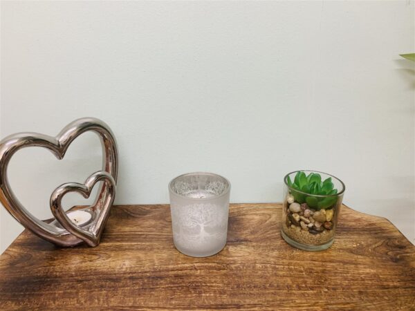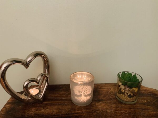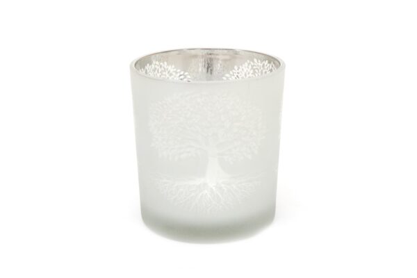 This tree of life frosted tealight holder is perfect for anywhere in the home. It will brighten up any area and show off the lovely design, creating a lovely homely feel. A glass tealight jar with frosted exterior and mirrored interior with a ghosted tree of life with the base diameter of 6.5cm and the top diameter 7.5cm. Overall measurements are: D7.5 x H8 x W7.5cm SKU: TL0021
