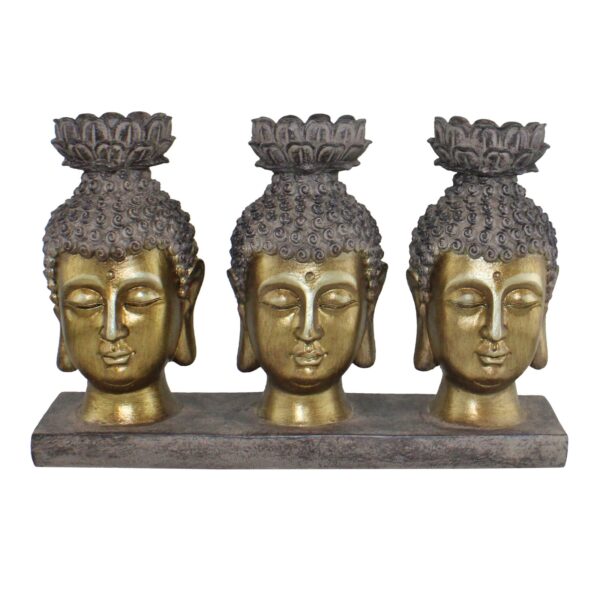 A stylish triple candle holder with 3 buddha heads on a base. Will hold 3 x candles of a maximum 4cm diameter such as tealights. Made of 100% polyresin. Measurements: 8 x 17 x 26.5cm SKU: BU0165