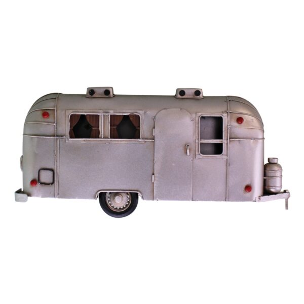 Perfect gift for caravanning lovers, a lovely vintage style silver metal camper to hang on a wall. Features lots of detail and 2 brackets on the rear for easy wall hanging. Made of iron with a PU wheel. Measurements: 4.5 x 17.5 x 38cm SKU: OR1413