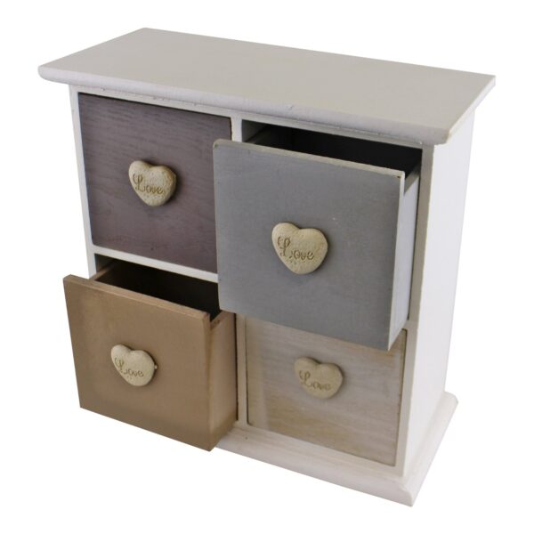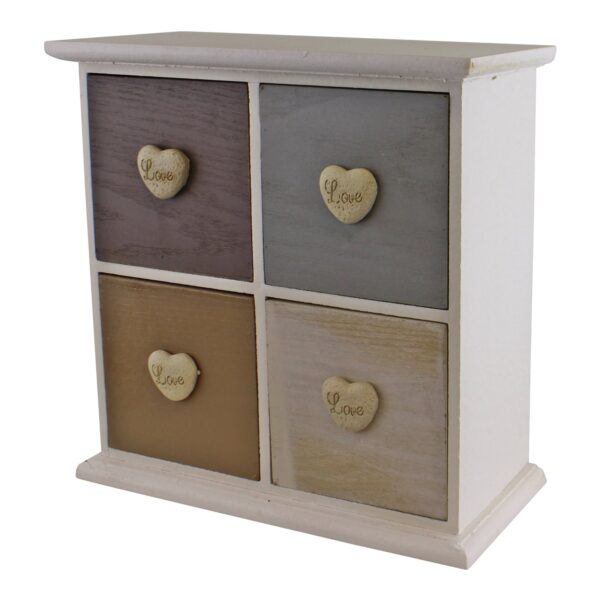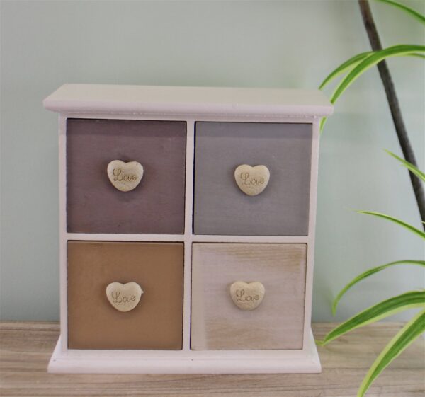 A lovely set of trinket drawers in a neutral colour scheme with 4 drawers featuring love heart design drawer handles. Made of MDF and Firwood. The drawers internal measurements are W8.5 D7.5 H8cm. Measurements: 10.5 x 24 x 24cm